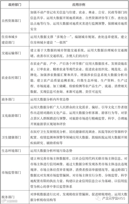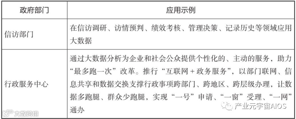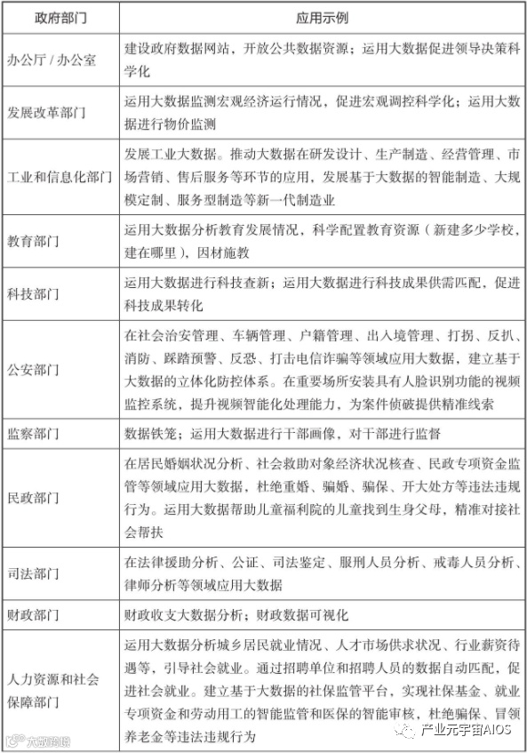 目前,大数据已在公安、工商、税务、旅游等部门得到应用,政府部门大数据应用领域如表1–2所示。