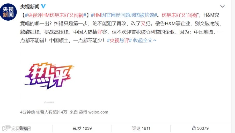 伤疤未好又“闯祸”,H&M究竟唱的哪一出?纠错只是第一步,绝不能犯了再改,改了又犯。敬告H&M等企业,别突破底线、触碰红线、挑战高压线。中国人热情好客,但不欢迎冒犯核心利益的企业。因为:中国地图,一点都不能错!中国领土,一点都不能少!