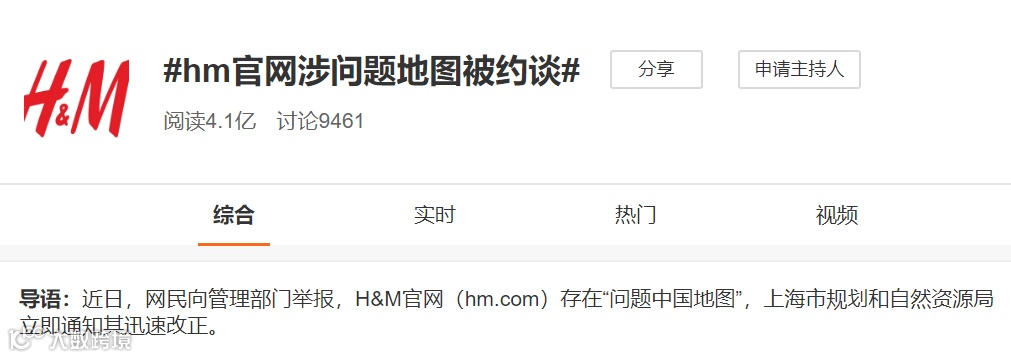 4月2日晚,#HM官网涉问题地图被约谈#冲上微博热搜第一。截至发稿,该话题阅读高达4.1亿。