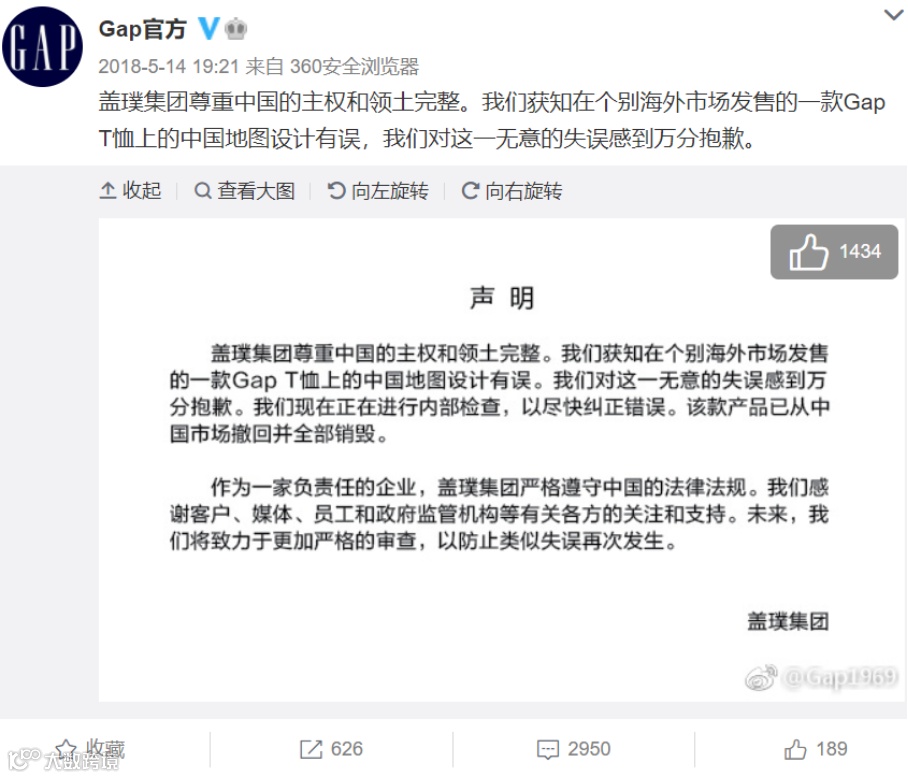 2018年5月14日,美国品牌GAP因在个别海外市场发售的一款Gap T恤上的中国地图设计有误向中国道歉,并称“该款产品已从中国市场撤回并全部销毁。”
