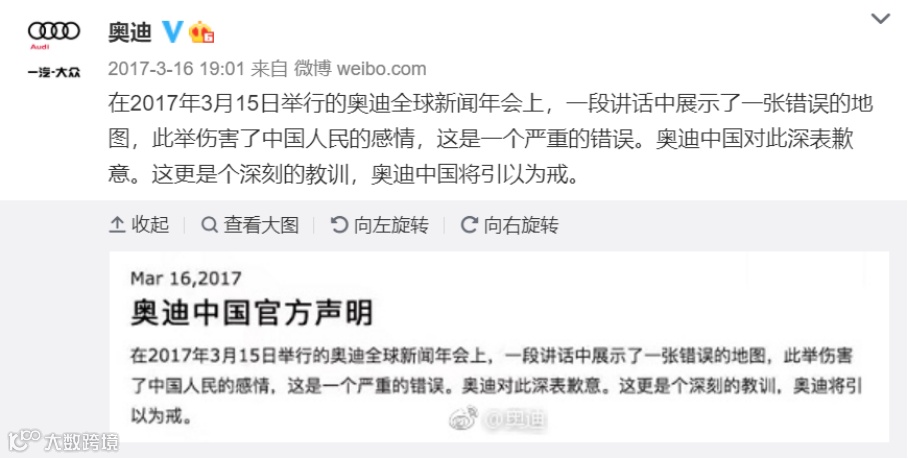2017年3月15日,奥迪召开全球新闻年会。年会中,展示了一张错误的中国地图。对此,当年3月16日,奥迪中国在微博致歉,称这是个深刻的教训,将引以为戒。