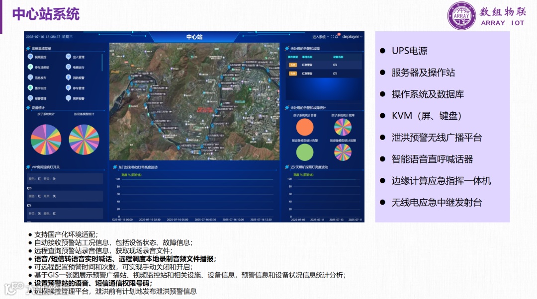 系统还包括UPS电源、服务器及操作站、操作系统及数据库、KVM(屏、键盘)、泄洪预警无线广播平台、智能语音直呼喊话器、边缘计算应急指挥一体机和无线电应急中继发射台等硬件设施。