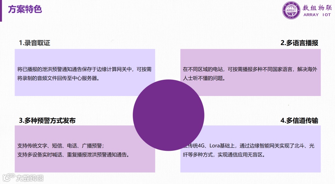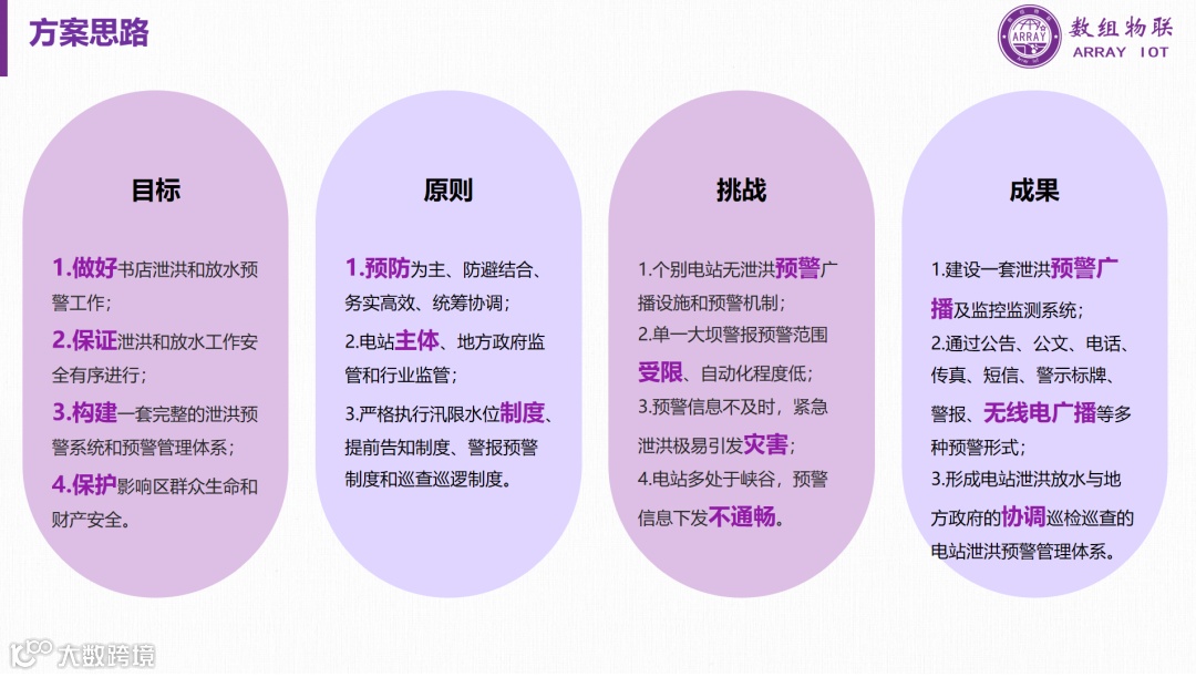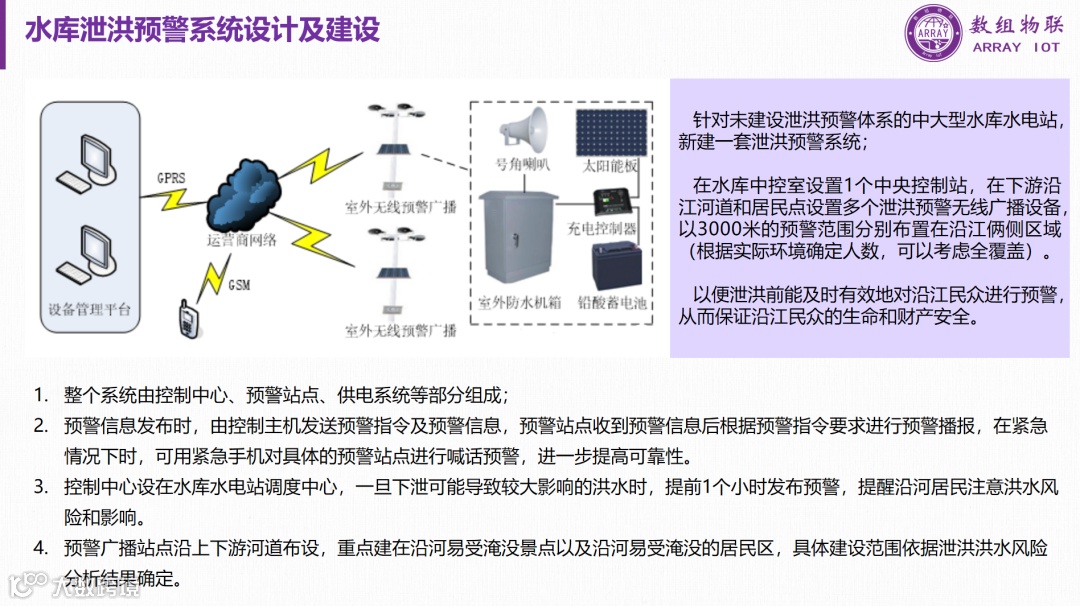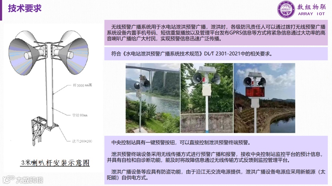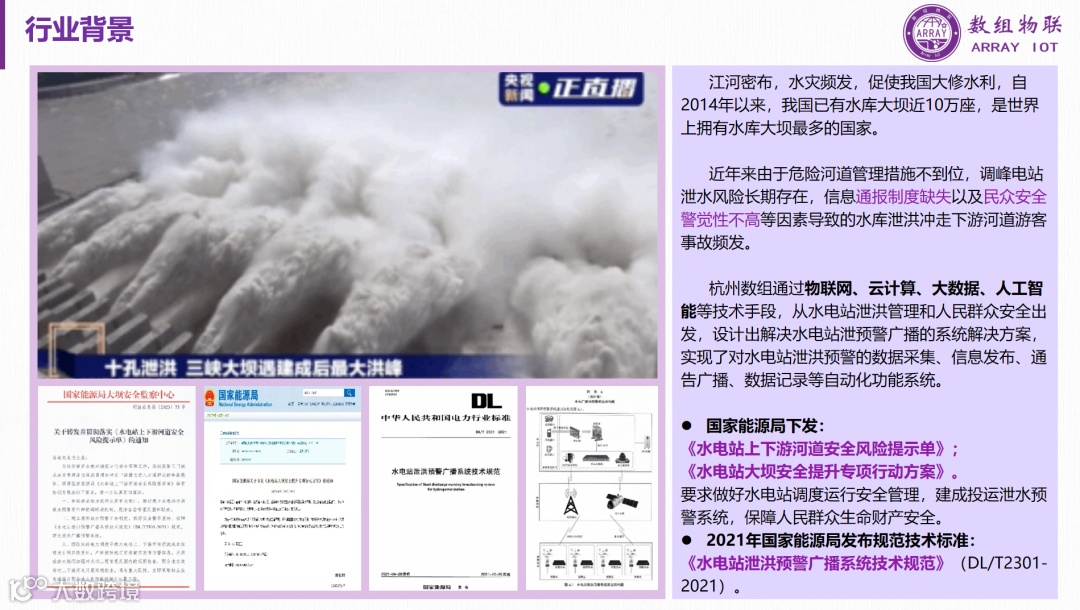 • 杭州数组通过物联网、云计算、大数据、人工智能等技术手段,从水电站泄洪管理和人民群众安全出发,设计出解决水电站泄洪预警广播的系统解决方案。
