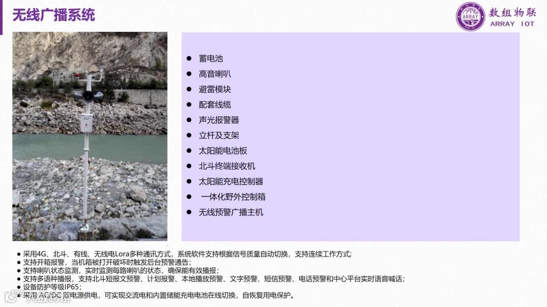 系统包括蓄电池、高音喇叭、避雷模块、配套线缆、声光报警器、立杆及支架、太阳能电池板、北斗终端接收机、太阳能充电控制器、一体化野外控制箱和无线预警广播主机等组件。