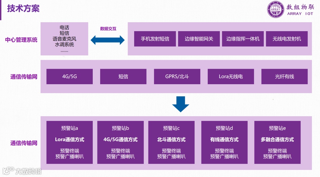 通过多种通信方式(如4G/5G、短信、GPRS/北斗、LoRa无线电、光纤有线)将数据从中心管理系统传输到不同的预警站。每个预警站使用不同的通信方式,并通过预警终端和预警广播喇叭进行预警信息的发布。这种多通信方式的融合可以提高系统的可靠性和灵活性。