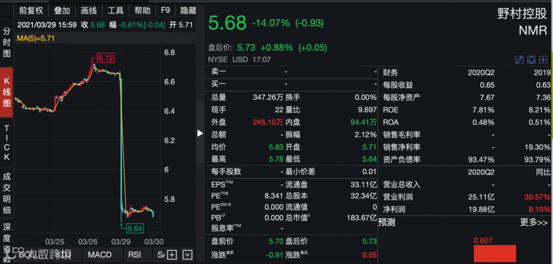 同日发布“亏损”公告的还有国际投行野村控股公司。野村控股表示,公司和一位美国客户的交易可能使野村美国的子公司遭受显著的亏损,根据3月26日的市场价格估算,亏损额有可能达20亿美元(约折合人民币130亿元)。野村控股美股周一跌14.07%。