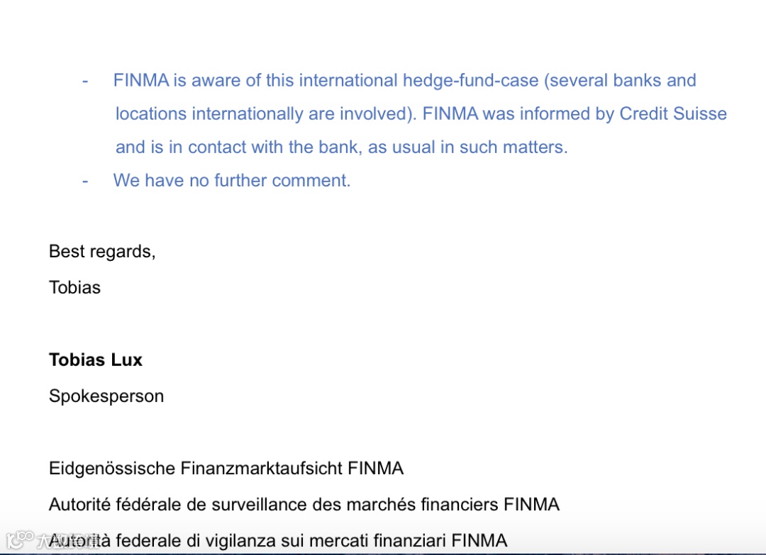 北京时间3月30日凌晨,瑞士金融市场监管局(FINMA)发言人Tobias Lux对中证君独家表示,FINMA注意到了这一国际对冲基金事件。瑞士信贷通知了FINMA相关情况。目前,FINMA已与瑞士信贷就相关事件联系。