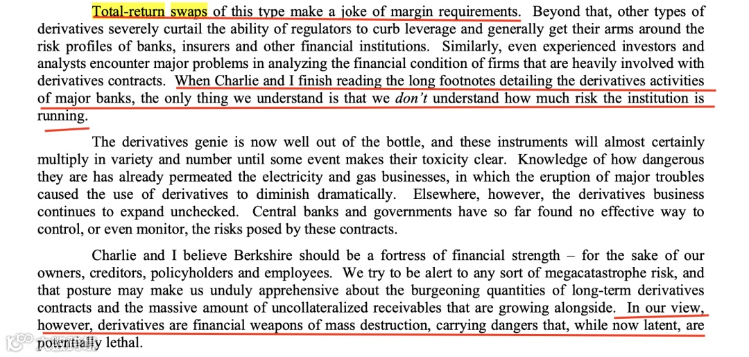 他写道,“(这种)总收益互换使得保证金要求像个笑话。当查理和我读完主要银行财务报告脚注中描述的衍生品活动时,我们唯一能理解的就是,我们完全不理解这些活动中蕴藏了多少风险……我们认为衍生品是金融领域的大规模杀伤武器,它们的风险目前来看可能是潜在的,但可能是致命的。”