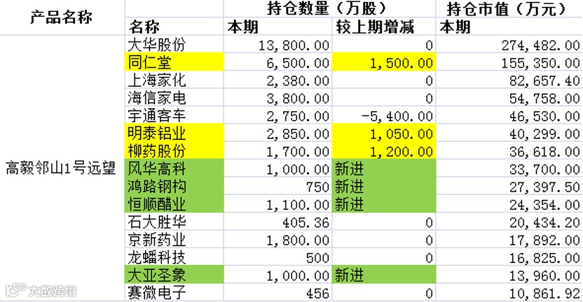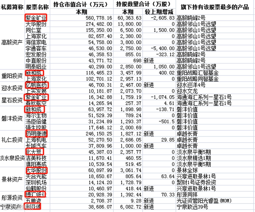 其中,持股市值超过5亿元的个股,有紫金矿业(高毅、星石)、大华股份(高毅、景林)、药明康德(礼仁)、同仁堂(高毅)、上海家化(重阳、高毅)、海信家电(高毅)、新和成(重阳、磐沣)、上海机电(礼仁)、海尔生物(磐沣),共计9只。