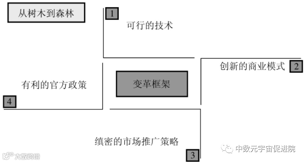 在这个框架中,包括四个相互依赖、相互促进的要素:可行的技术、创新的商业模式、缜密的市场推广策略,以及有利的官方政策。