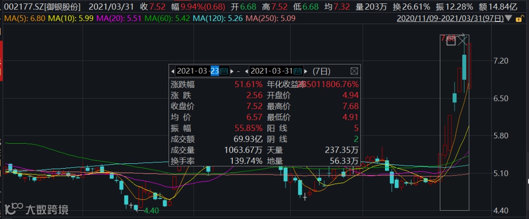 3月31日,御银股份再度涨停。自3月23日以来,御银股份7个交易日收获4个涨停板,累计涨幅达51.61%。