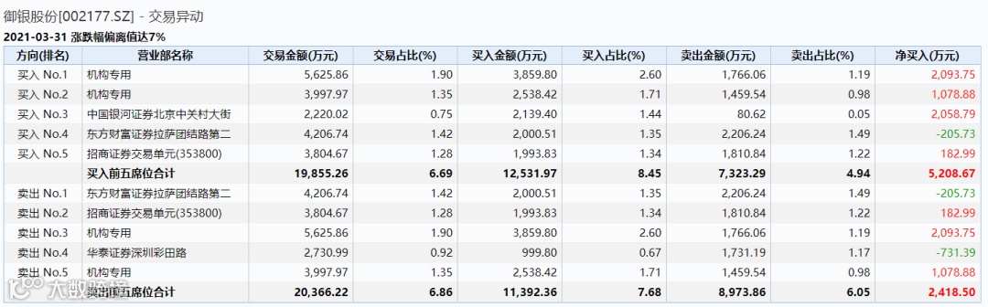 其中,御银股份最为“抢手”。数据显示,3月31日,御银股份换手率达26.61%,成交额14.84亿元。前两大买入席位均为机构专用,合计净买入额超过3000万元。