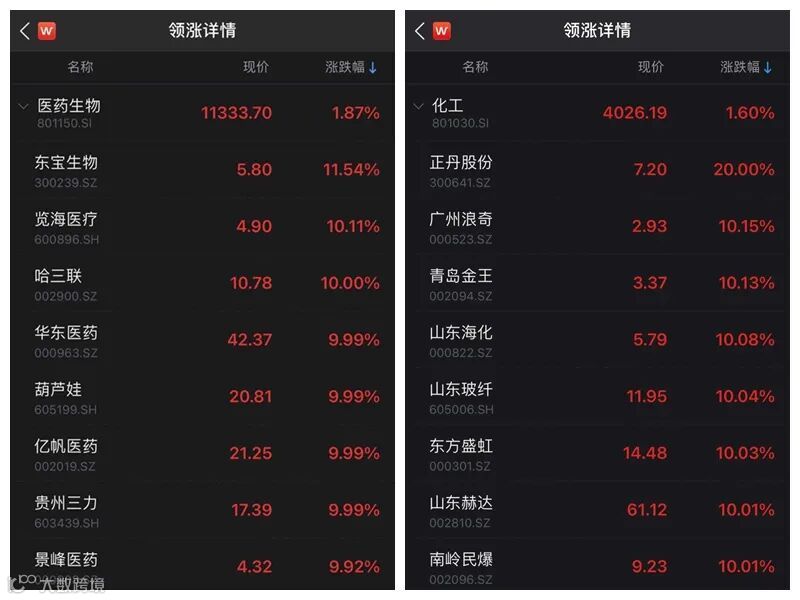 医药生物和化工板块亦表现强势,华东医药、览海医疗、葫芦娃、正丹股份、广州浪奇等多股涨停。有股民在葫芦娃股吧里逗趣说:“来七个葫芦娃,七个涨停,再合体大葫芦娃。”“瓜娃子还不快来救你爷爷我!我被妖怪抓走了啊!”