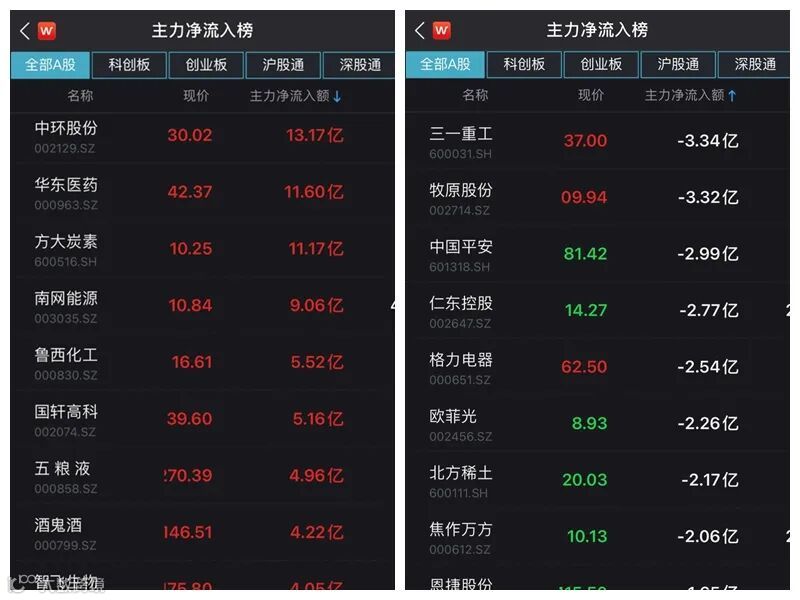 从主力资金流向看,中环股份、华东医药、方大炭素、南网能源等净流入额居前;三一重工、牧原股份、中国平安、仁东控股等净流出额居前。