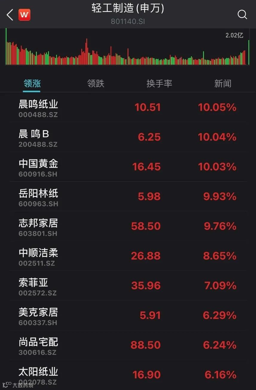 轻工制造板块中,造纸印刷和木业家具相关股票走强,岳阳林纸、晨鸣纸业涨停,志邦家居、索菲亚、中顺洁柔、博汇纸业、太阳纸业等涨幅居前。