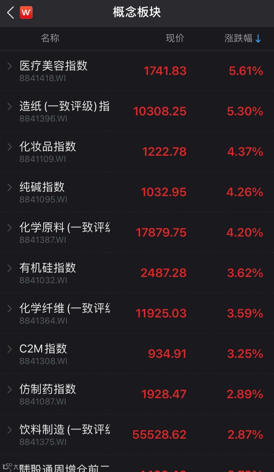 概念板块中,医疗美容、造纸、纯碱、化学原料等概念板块涨幅居前,白酒、光伏等此前机构重仓概念板块延续反弹;稀土、乡村振兴、稀土永磁、第三代半导体等概念板块跌幅居前。