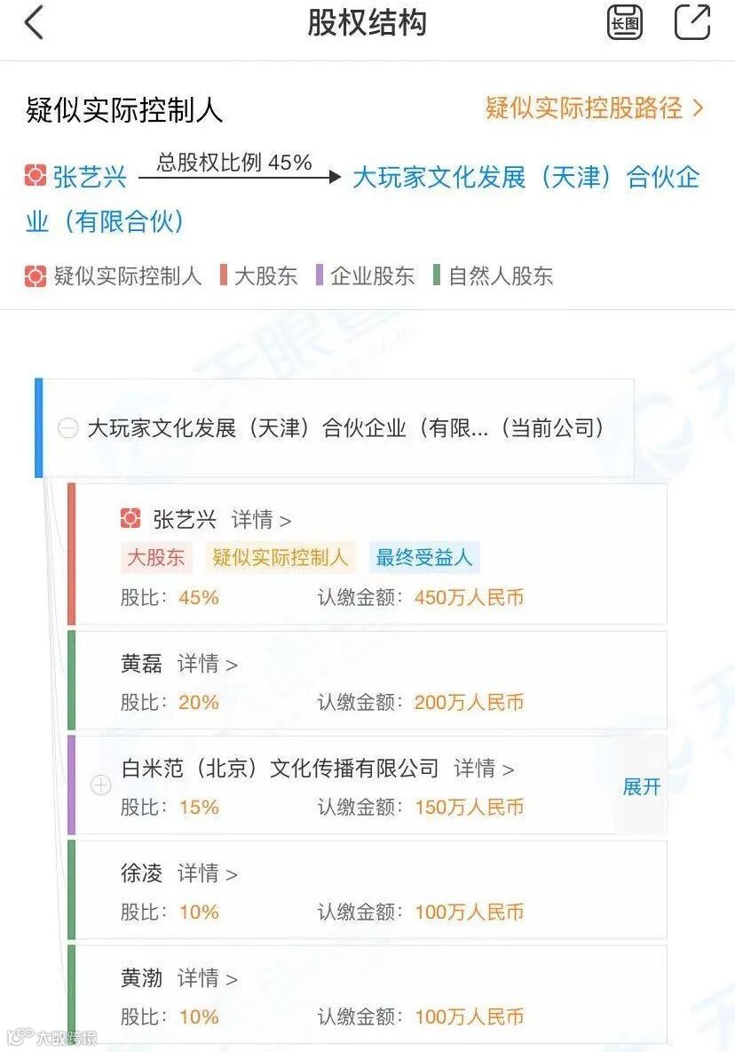 天眼查资料显示,大玩家文化发展(天津)合伙企业(简称:大玩家)注册资本为1000万元人民币,共有5名股东,分别是张艺兴、黄磊、白米范(北京)文化传播有限公司、黄渤以及徐凌,持股比例分别为45%、20%、15%、10%、10%。