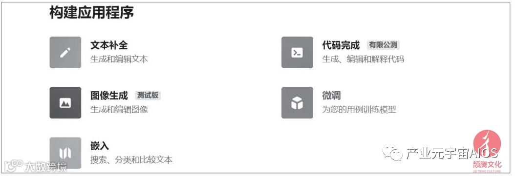 但是,OpenAI API不仅仅提供ChatGPT,还提供了其他的人工智能技术,如下图所示。