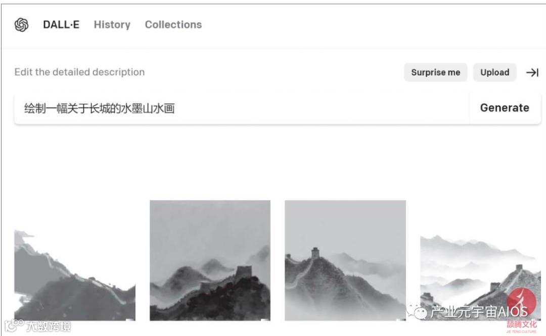 例如,输入一段文字描述:“绘制一幅关于长城的水墨山水画”,DALL·E 2就可以生成与描述文字相符的图像,如下图所示。