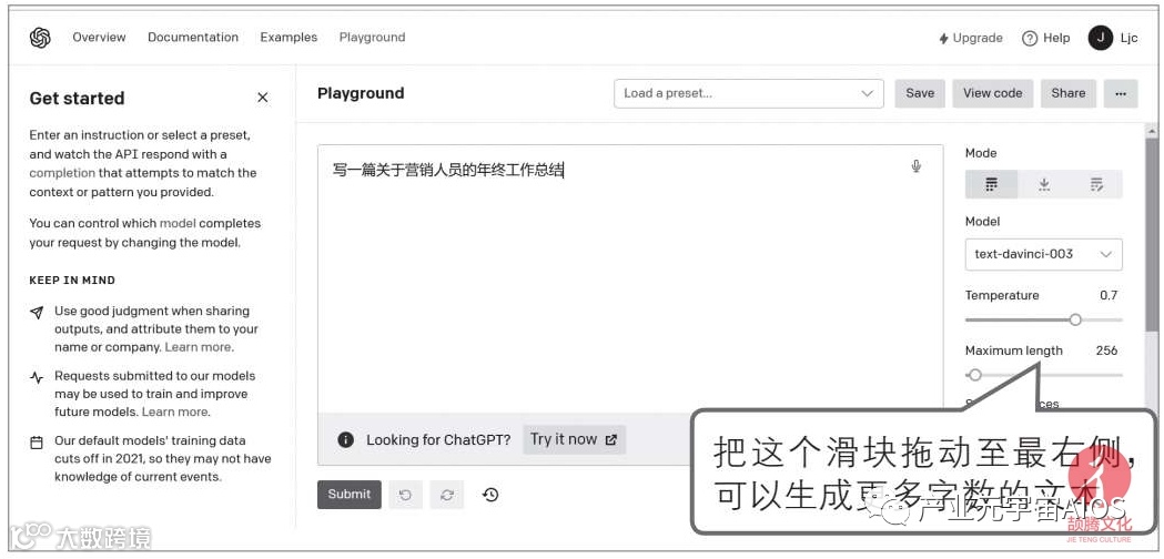 输入文字描述:“写一篇关于营销人员的年终工作总结”,如下图所示,然后将字符长度滑块拖动至最右侧,再单击“Submit”按钮。