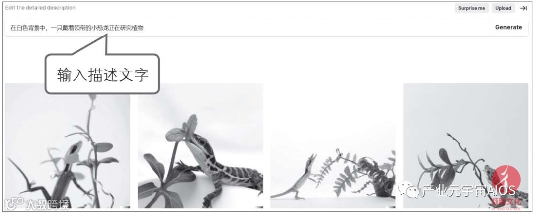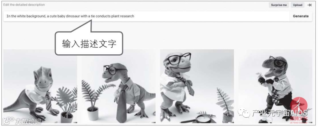 举个例子,若输入文字描述:“在白色背景中,一只戴着领带的小恐龙正在研究植物”,得到的结果如下图所示。