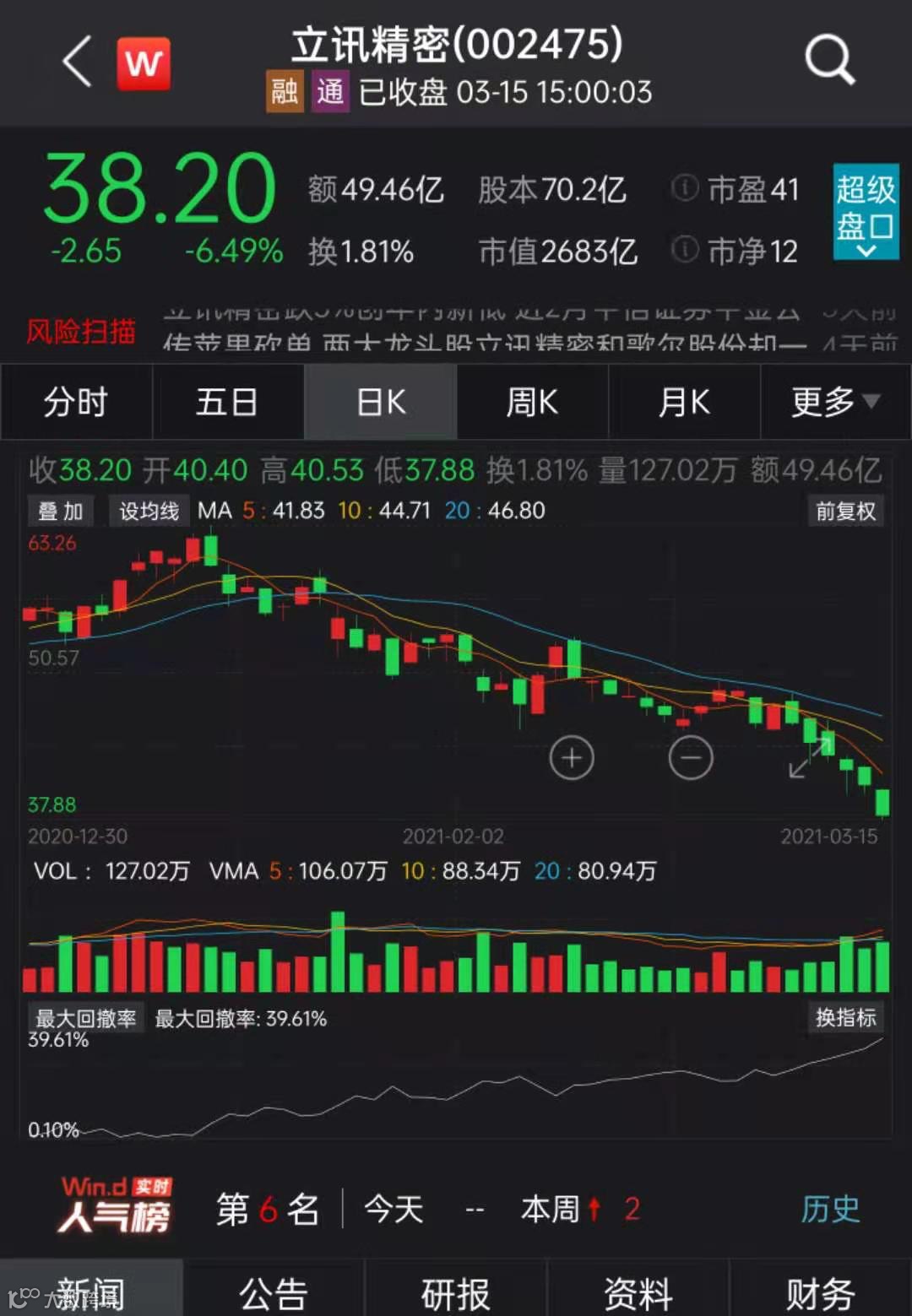 3月15日,立讯精密收报38.20元,跌6.49%,这已是公司股价连续第6个交易日收跌。Wind数据显示,立讯精密六连阴期间,股价累计跌19.80%,总市值从3月5日收盘的3344.86亿元缩水至3月15日收盘的2682.63亿元,6个交易日蒸发662.23亿元。