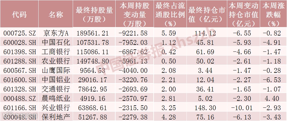 本周北向资金减仓股数前十个股