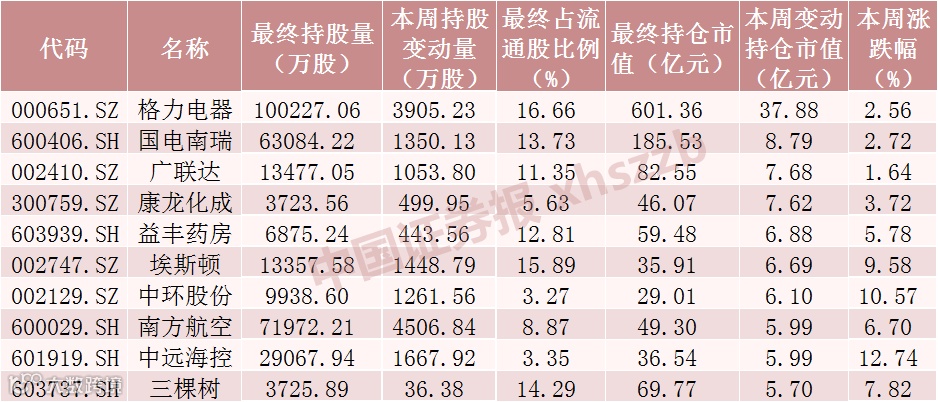 本周北向资金持仓市值增加额前十的个股均被加仓,其中北向资金对格力电器、国电南瑞、广联达、埃斯顿、中环股份、南方航空、中远海控加仓股数超1000万股。