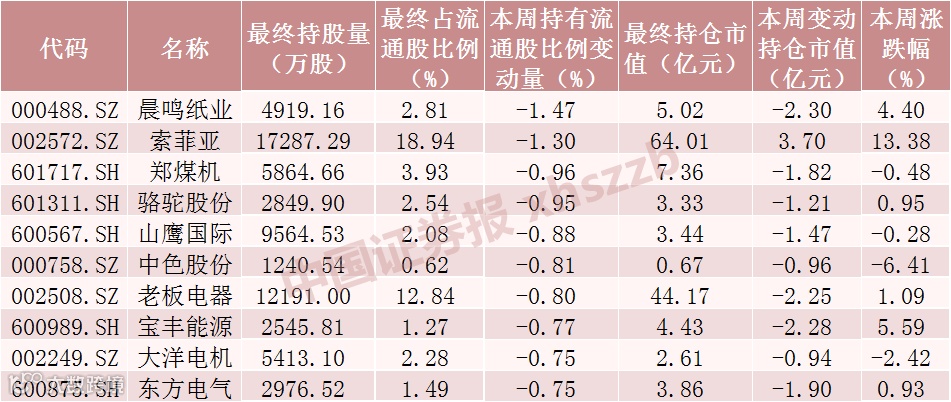 从市场表现上看,本周北向资金持有流通股比例减少前十的个股中,郑煤机、山鹰国际、中色股份、大洋电机下跌,其他6只个股均上涨,索菲亚周涨幅最大,上涨13.38%。