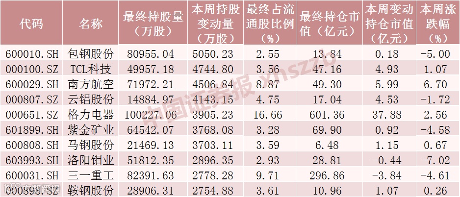 本周北向资金加仓股数前十个股