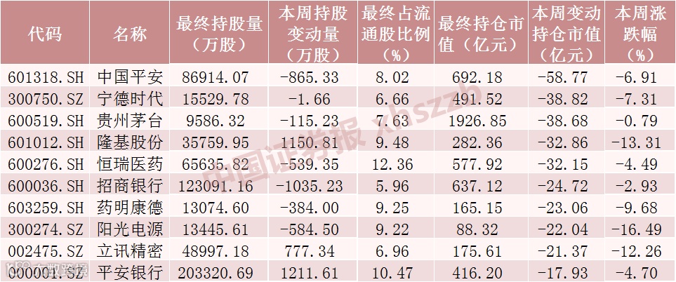 本周北向资金持仓市值减少额前十个股
