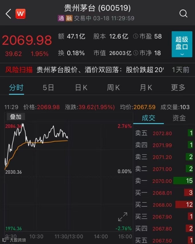 白酒概念板块18只成分股早盘全线上涨。其中,酒鬼酒以8.33%的涨幅领涨,山西汾酒、泸州老窖均涨逾5%;贵州茅台上涨1.95%,报2069.98元,最新市值为26003亿元。