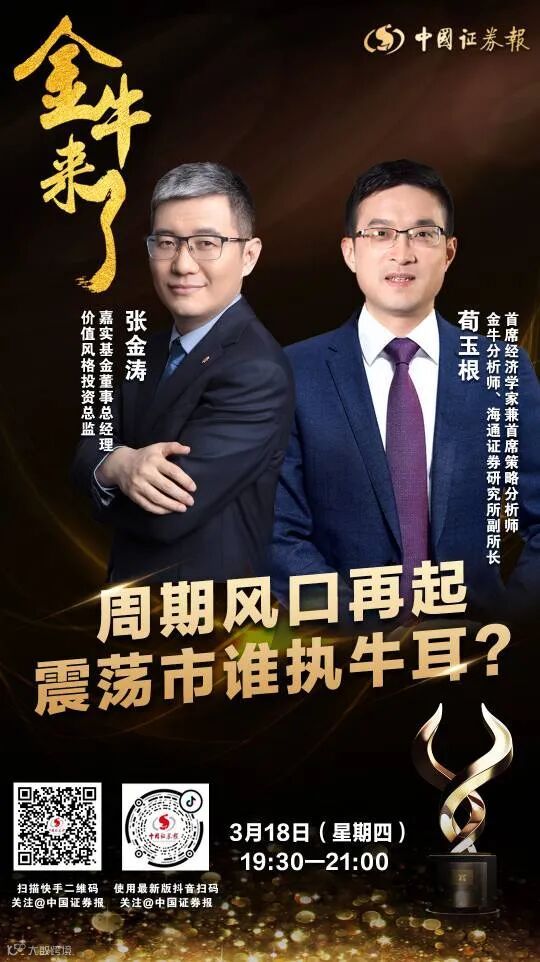 3月18日(周四)晚7点半,嘉实基金董事总经理、价值风格投资总监张金涛和海通证券首席经济学家兼首席策略分析师荀玉根将做客中证报“金牛来了”,围绕“周期风口再起震荡市谁执牛耳?”为你在线答疑解惑。