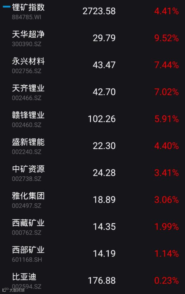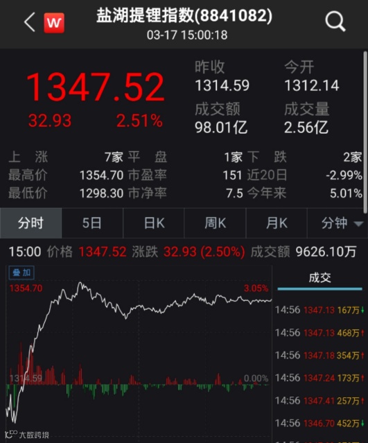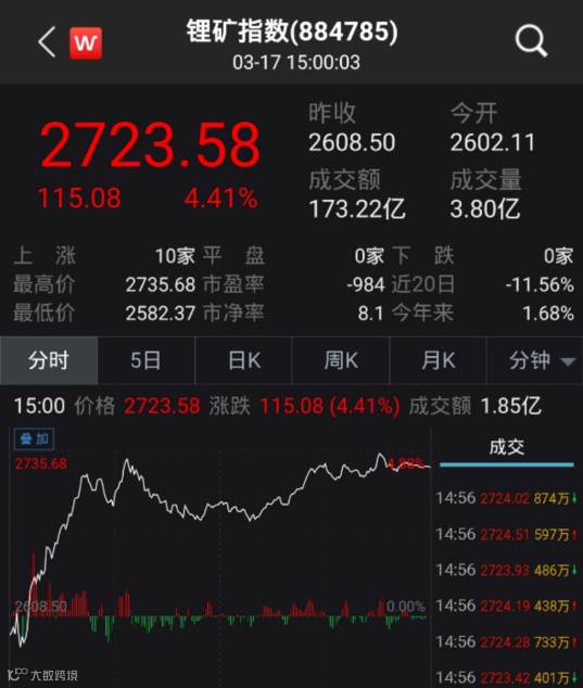 Wind数据显示,3月17日,锂矿板块10只个股全线飘红,当日成交额173.22亿元。天华超净涨9.52%、天齐锂业涨7.02%、赣锋锂业涨5.91%、永兴材料涨7.44%。