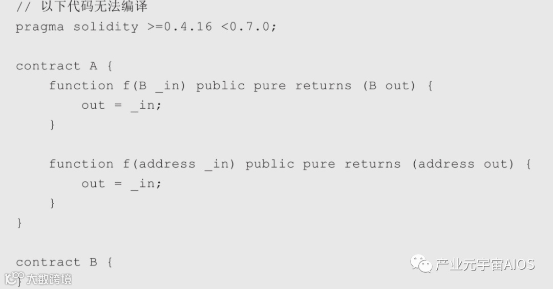 以上两个f()函数重载时,一个使用合约类型,一个是地址类型,但是在对外的ABI表示时,都会被认为是地址类型,因此无法实现重载。