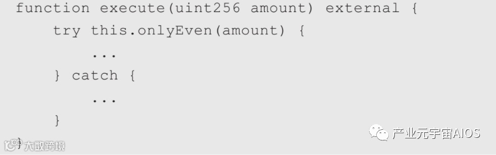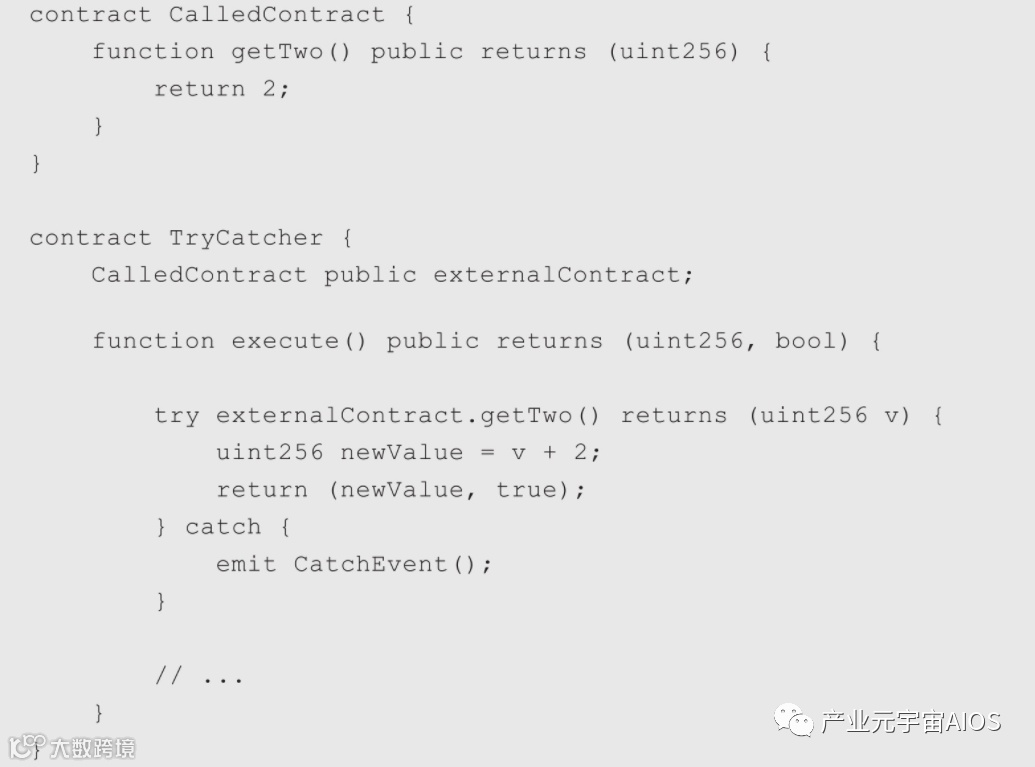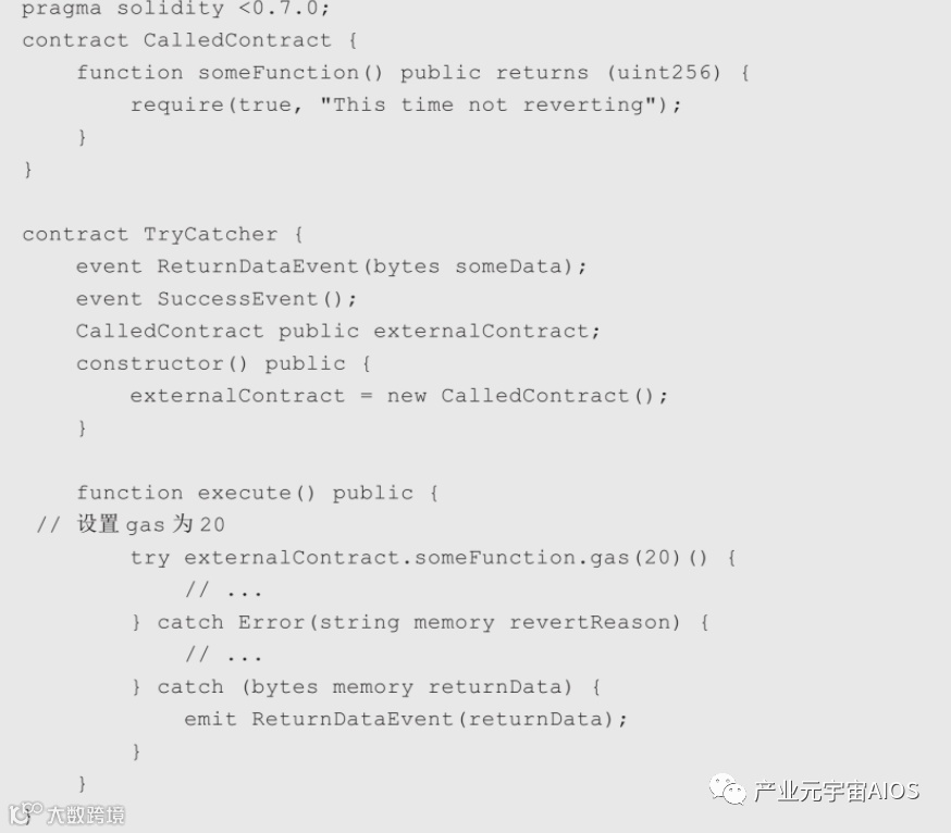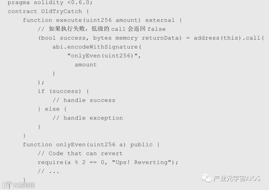 在Solidity 0.6之前,模拟try/catch仅有的方式是使用低级的调用,如call、delegatecall和staticcall,这是一个简单的示例,在Solidity 0.6之前实现某种try/catch。