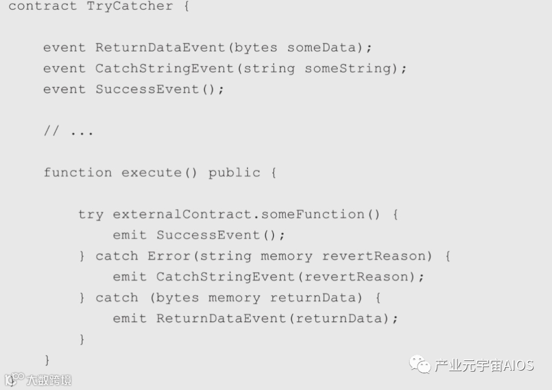 在catch语句中也可以使用返回值,外部调用失败时返回的数据将转换为bytes,catch中考虑了各种可能的revert原因,不过如果由于某种原因转码bytes失败,则try/catch也会失败,会回退整个交易。