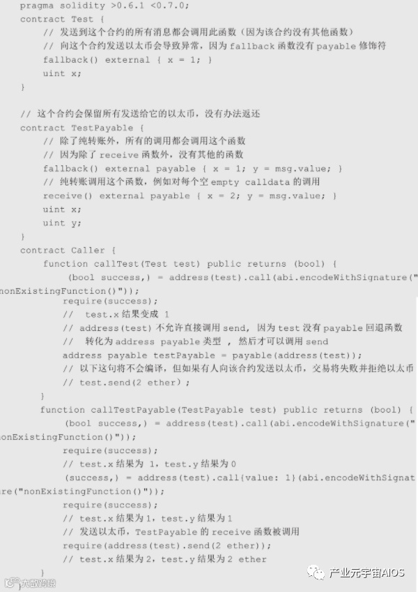 ·<address>.staticcall(bytes memory)returns(bool, bytes memory)这3个函数用直接控制的编码[给定有效载荷(payload)作为参数]与合约交互,返回成功状态及数据,默认发送所有可用gas。