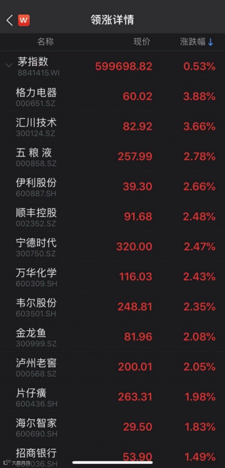 Wind茅指数上涨0.53%,格力电器、汇川技术涨逾3%,五粮液、伊利股份、顺丰控股等涨逾2%。