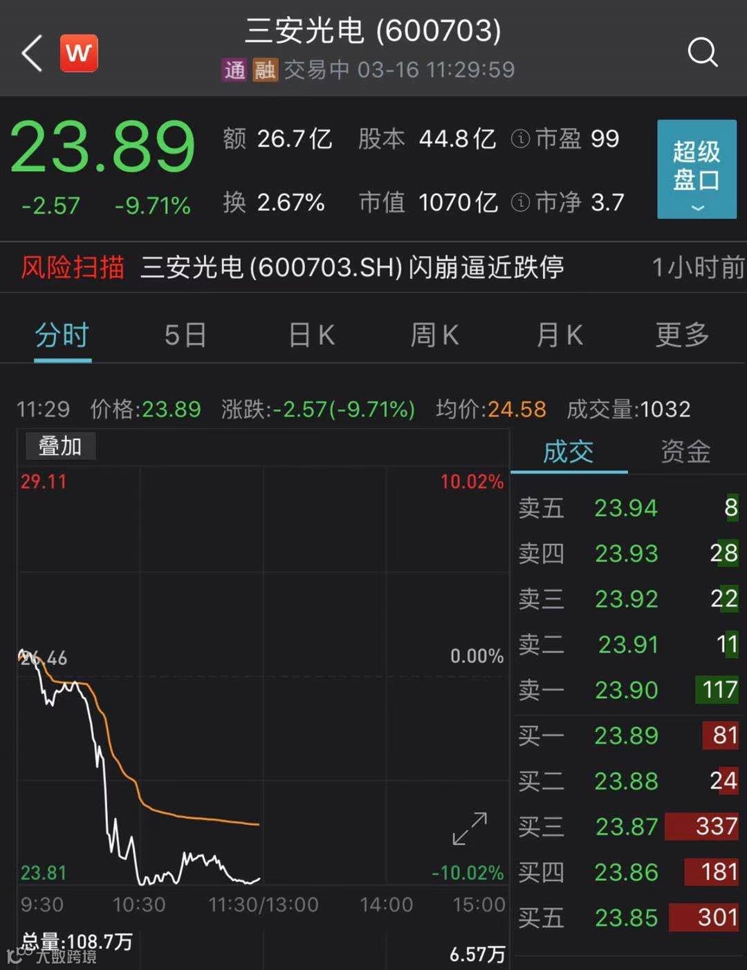 半导体板块整体走弱,Wind半导体指数下跌0.84%,其中三安光电下跌9.71%。相较1月13日创下的36.44元高点,三安光电已下跌34.44%。