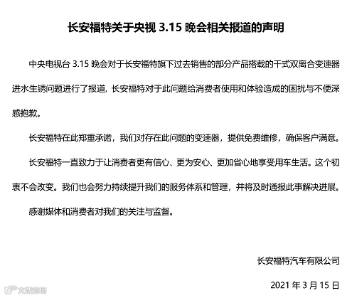 而长安福特在声明中表示,对于此问题给消费者使用和体验造成的困扰与不变深感抱歉。并承诺对存在此问题的变速器提供免费维修。