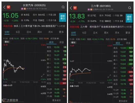 在今日市场高开的情况下,三六零和长安汽车双双低开,随后跌幅收窄。截至午间收盘,三六零下跌1.71%,长安汽车下跌1.25%。