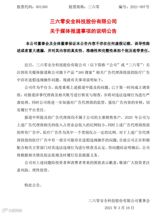 今日早间,三六零公告称,已关注到有关媒体报道称公司旗下产品“360搜索”相关广告代理商投放的医疗广告中存在造假违规操作问题。公司已第一时间成立调查组,对报道涉事代理商及相关账号进行核实与彻查,并将对违法违规行为进行严肃处理。同时公司将进一步加强对广告代理商的监管,强化广告内容的审核,切实履行平台责任。