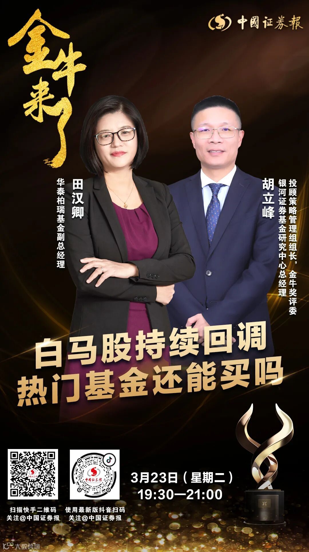 3月23日(周二)晚七点半,华泰柏瑞基金副总经理田汉卿、银河证券基金研究中心总经理胡立峰,将做客中证报“金牛来了”,围绕“白马股持续回调 热门基金还能买吗?”为你揭晓基金的奥秘。还等什么?进入中国证券报抖音和快手直播间,听大咖分享2021年投资独门秘籍。