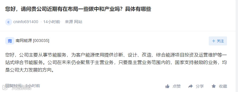 南网能源主要从事节能服务,为客户能源使用提供诊断、设计、改造、综合能源项目投资及运营维护等一站式综合节能服务。公司通过整合节能环保技术,利用高效节能环保设备,转变客户用能来源、用能方式,在满足客户对各类能源(电、热、冷、蒸汽、压缩气体等)需求的同时,降低客户用能投资风险,提升客户能源使用效率、减少能源费用和碳排放。这一业务特点刚好匹配了当前市场上炙手可热的碳中和概念。