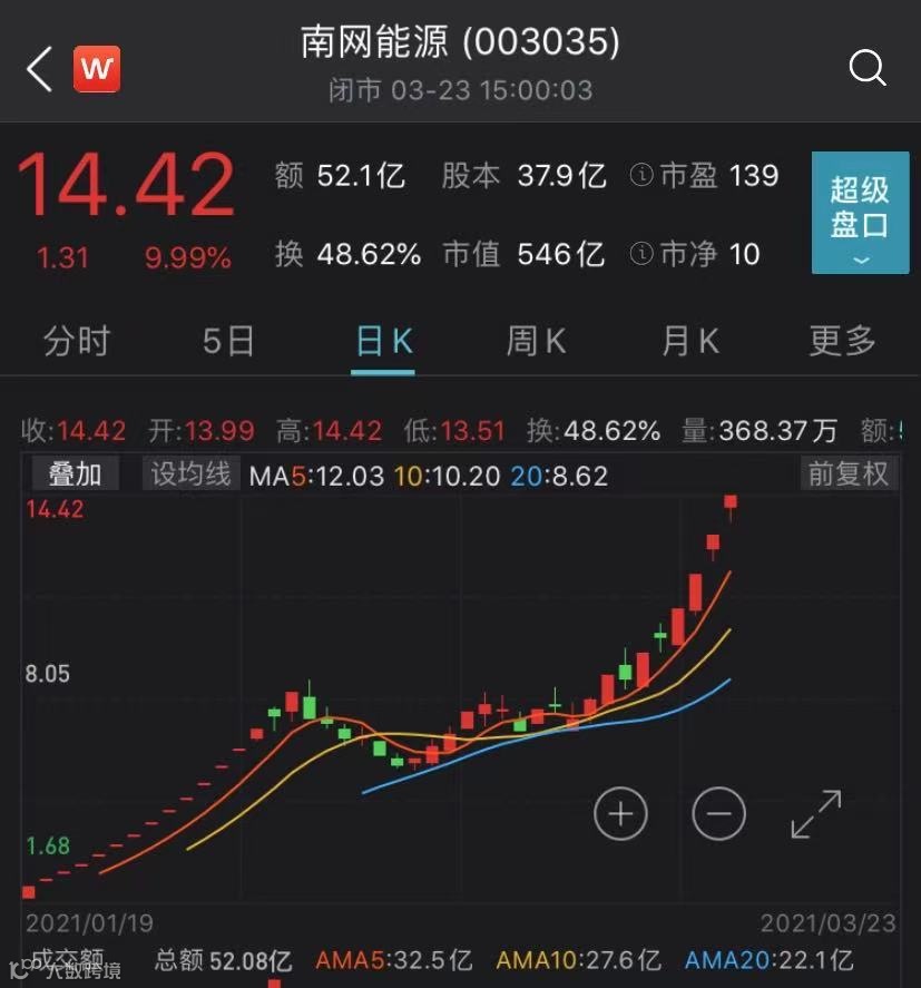 搭上碳中和的东风,南网能源近来涨势凌厉。3月23日,南网能源再度涨停,报收于14.42元,录得四连板,成功跻身为今年以来A股首只10倍股。