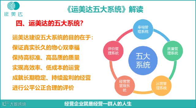 董事长说:企业竞争的核心就是系统竞争,谁先建立了系统,谁的系统先进并应用得力,谁就能低成本、高效率、自动并和谐,谁最强!运美达一直追求全员的自我管理,并能在各自的体系中依靠系统的力量自动且高效的良性运转。运美达五大系统的建设,将涉及组织战略、组织设计、流程管理、评价管理等方面,而运美达的五大系统具有全面性、闭环性、预见性、协同性、适应性、自我纠偏性和预警性等特点。
