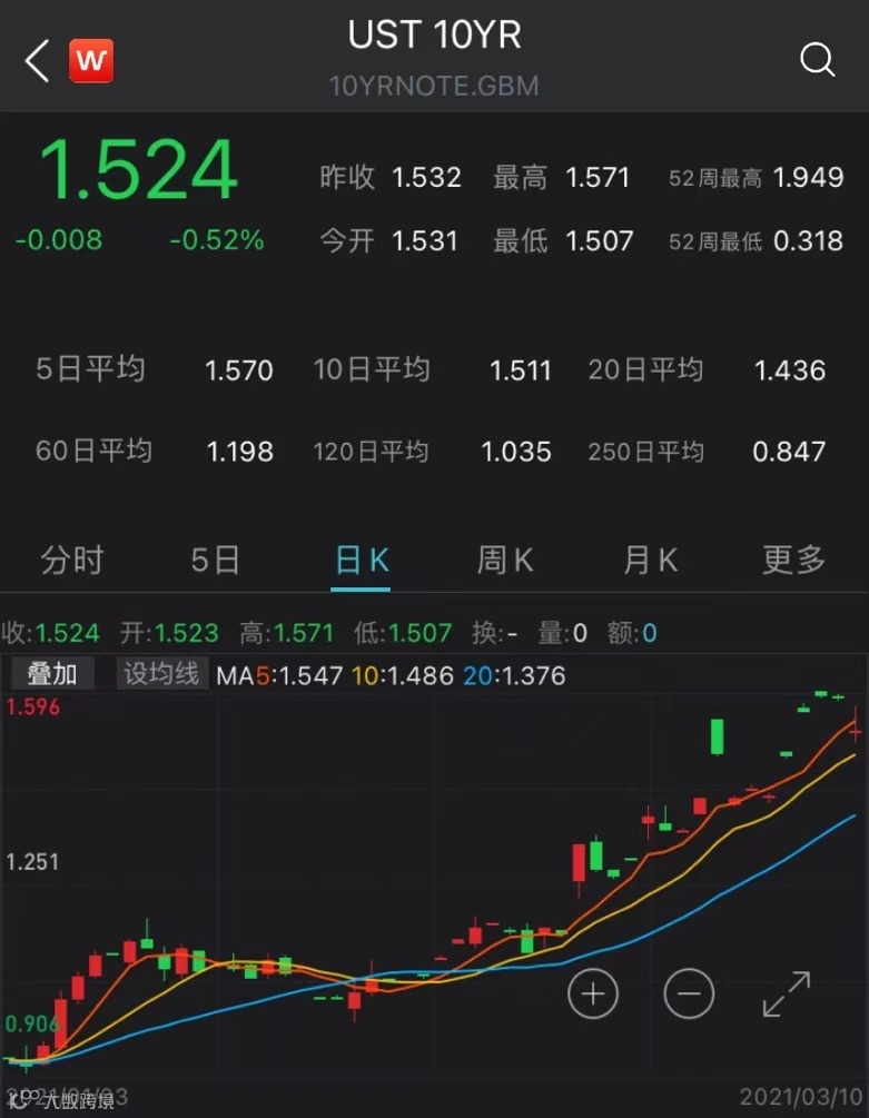 对于此次10年期国债的拍卖结果,彭博报道称,这一结果避免了市场的“灾难”。市场也给予了正面回应,据Wind数据,截至当地时间3月10日收盘,10年期美债收益率跌0.8个基点报1.524%,为连续第二个交易日回落。