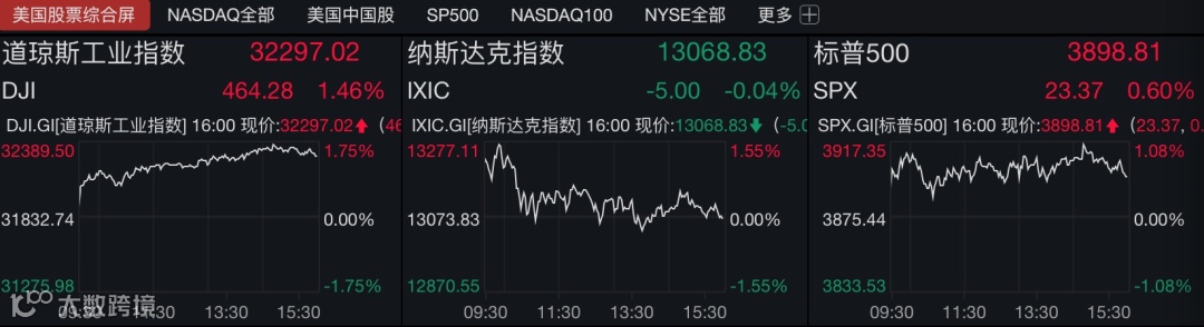 据Wind数据,截至收盘,道琼斯工业指数涨1.46%,报32297.02点,创历史新高;纳斯达克指数跌0.04%,报13068.83点,盘初一度涨逾1.5%;标普500指数涨0.60%,报3898.81点。