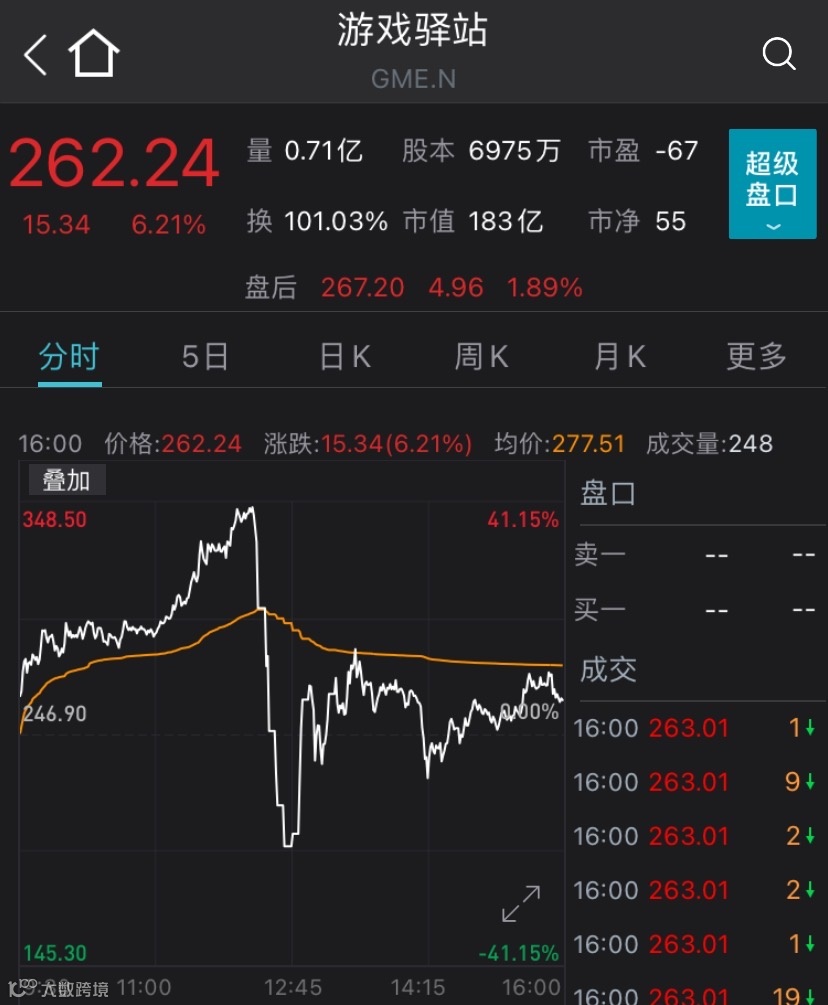 其中,游戏驿站盘中一度冲高至348.50美元,涨幅达41.15%,成为罗素2000指数第一大成分股;但随后大幅跳水,一度跌约20%;收盘时涨幅为6.21%。高斯电子、AMC娱乐控股等WSB概念股也走出类似走势。